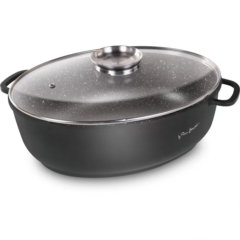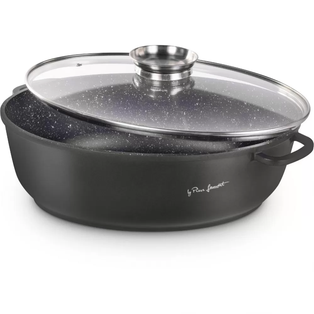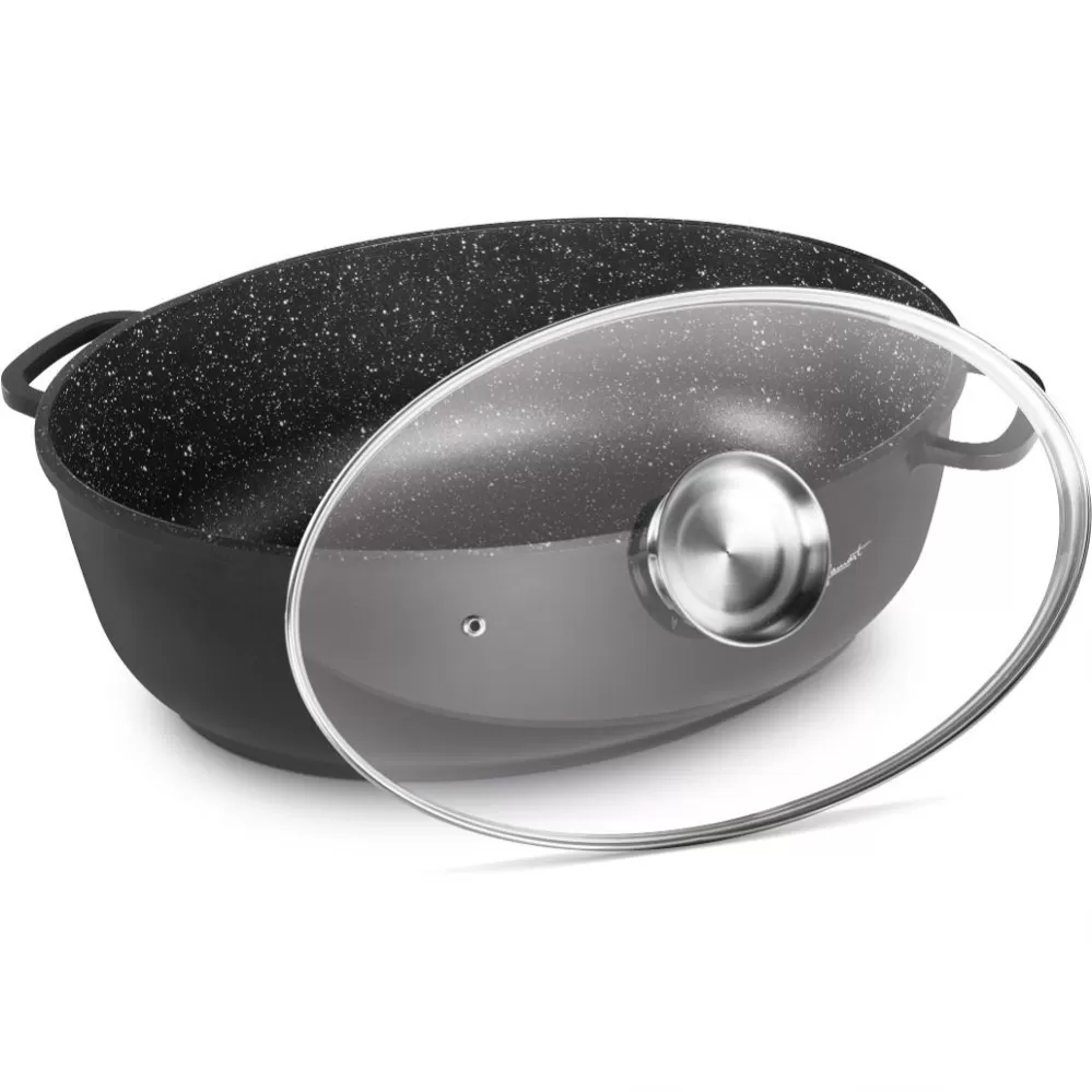 Kvalitní hliníkový litý pekáč se skleněným víkem s vnitřním povrchem odolným proti připalování, opatřen silným dnem. Poklice z odolného varného skla s aroma otvorem páry pro dokonalou kontrolu vaření.