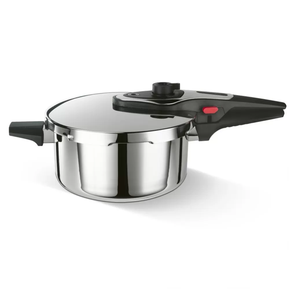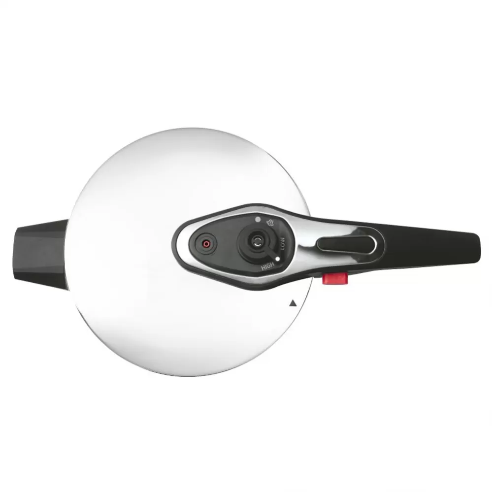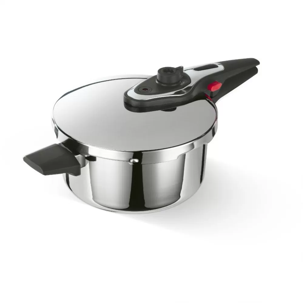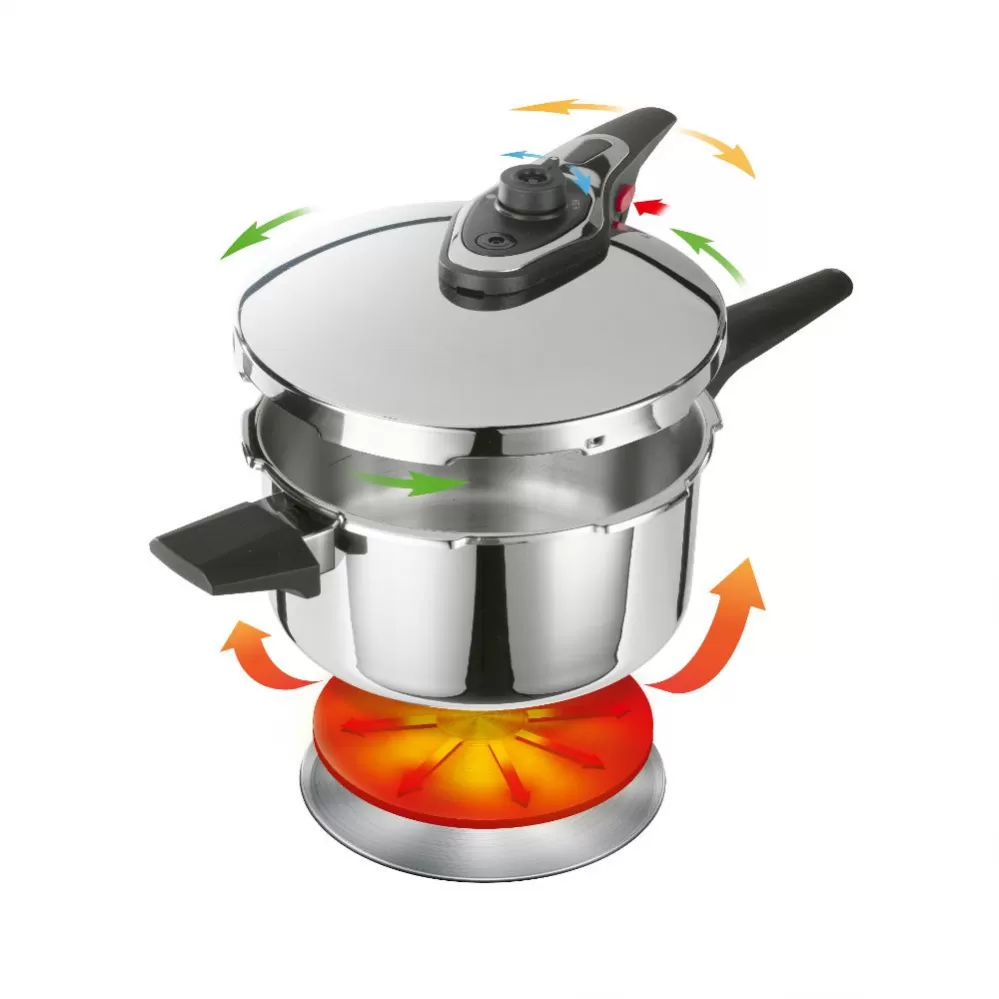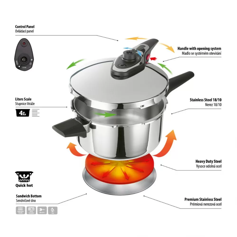 Čtyři pojistky, indikátor tlaku a dvojí bezpečnostní ventil zajišťují maximální bezpečnost při vaření. Sendvičové dno umožňuje rovnoměrné rozložení tepla, což zkracuje dobu vaření a šetří energii. Moderní design hrnce dodá vaší kuchyni elegantní vzhled.