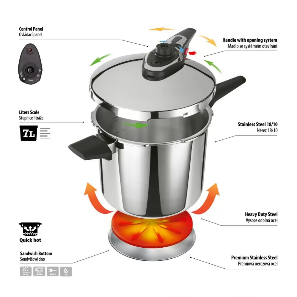 Tlakový hrnec 7L. Tento tlakový hrnec je vyroben z vysoce kvalitní nerezavějící oceli 18/10 a velmi odolného plastu. Je vybaven masivní rukojetí pro pohodlné a bezpečné uchopení.