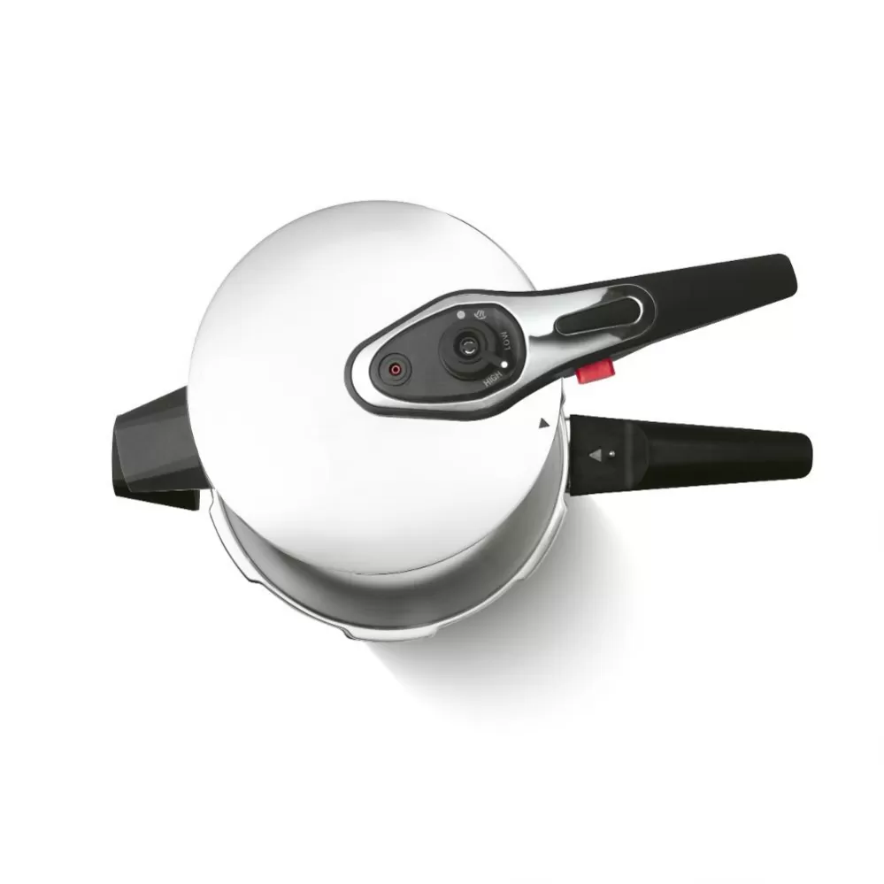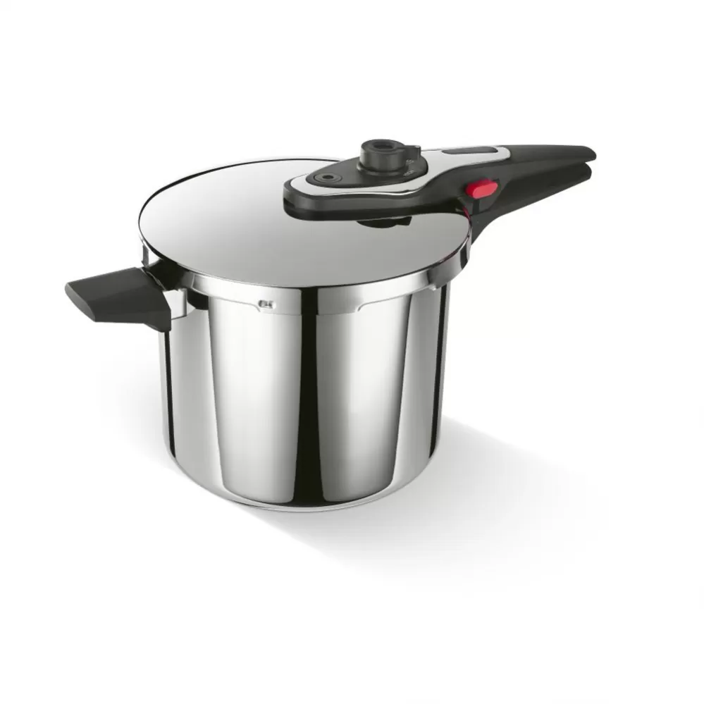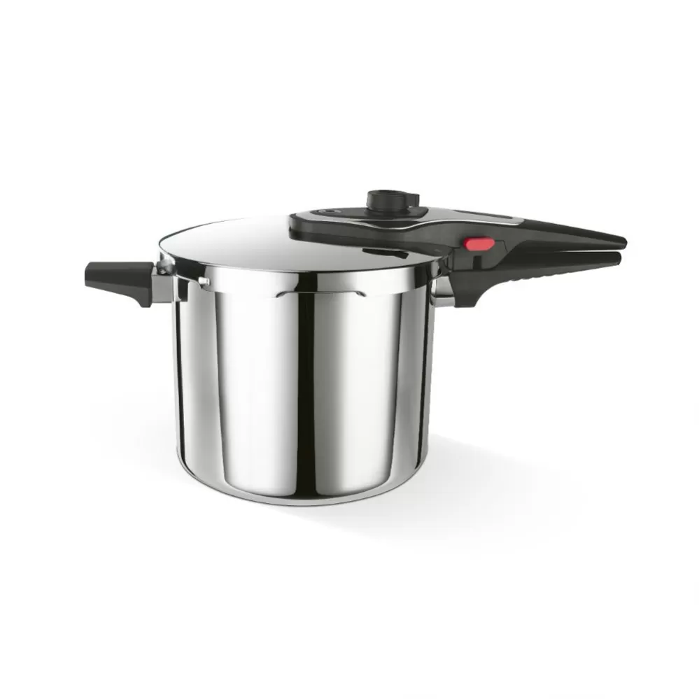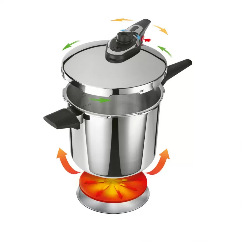 Čtyři pojistky, indikátor tlaku a dvojí bezpečnostní ventil zajišťují maximální bezpečnost při vaření. Sendvičové dno umožňuje rovnoměrné rozložení tepla, což zkracuje dobu vaření a šetří energii. Moderní design hrnce dodá vaší kuchyni elegantní vzhled.